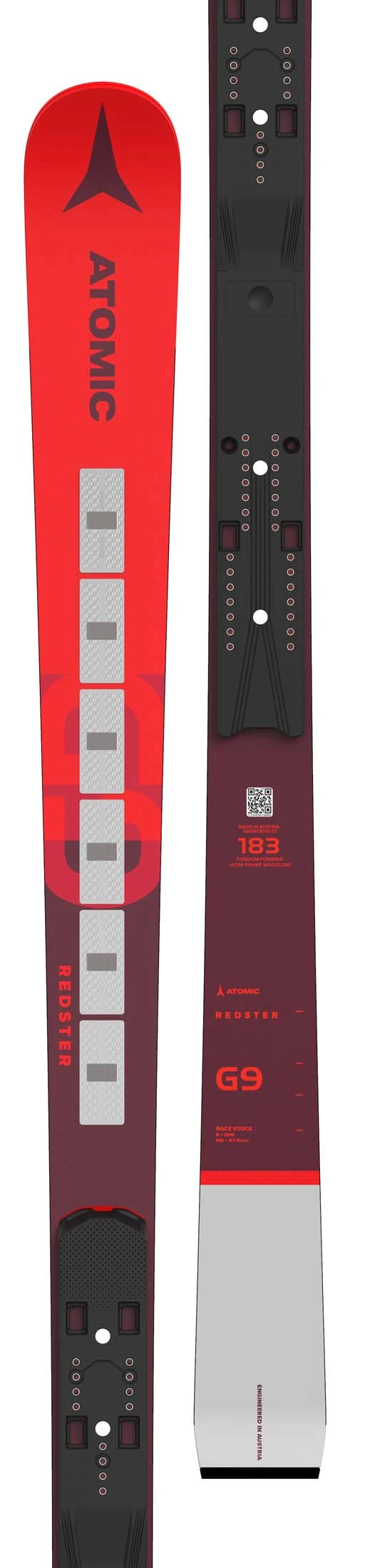 The Atomic Redster G9 RS Revoshock 183 was made to get Master’s GS racers through the gates as fast as possible. Chasing hundredths of a second on race day is as much about control and efficiency as pure speed. That’s what Atomic’s Revoshock technology is all about. Made up of a series of spring steel plates encased in an integrated elastomer compound, Revoshock absorbs bumps, keeping the ski smooth and stable without sacrificing super quick edge-to-edge agility and powerful accelerations out of every turn – the ultimate in handling. Full-length sidewalls create insane edge hold while Ultra TI Powered laminate keeps the ski torsionally rigid, no matter how rutted out the course might be. Atomic’s Ultra Power Woodcore and Active Race Interface binding platform keep you in control from start to finish.